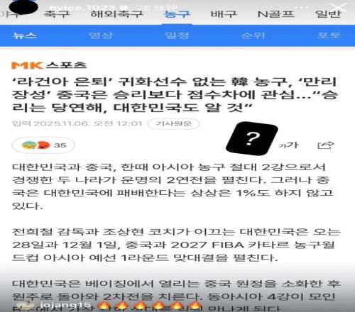 李賢重之前基本上沒有更新過自己的社交媒體,但是在擊敗中國男籃后,他立馬將之前韓國媒體報道的,韓國隊(duì)很難戰(zhàn)勝中國男籃的新聞截圖上傳,還打上了一個大大的問號。